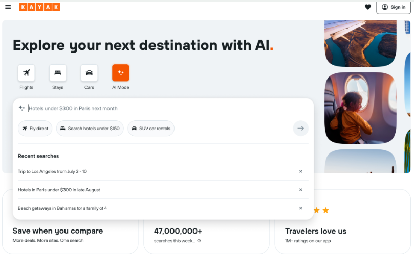 Kayak推出"AI模式",用户可通过内置聊天机器人直接研究、规划和预订旅行。该功能支持航班、酒店和租车服务的比较查询,利用ChatGPT集成技术提供更精准的搜索结果,现已在网页和移动端上线。