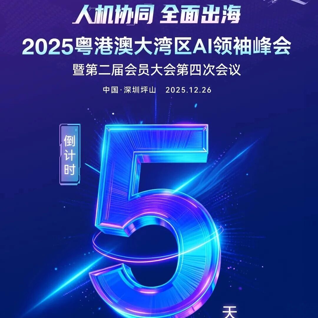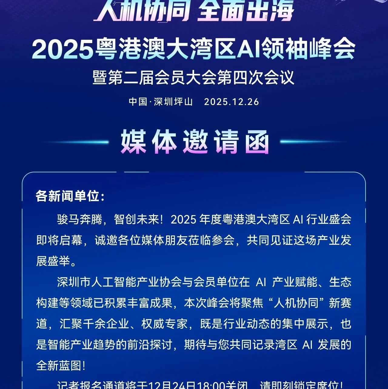 各新闻单位:2025年12月26日,中国・深圳坪山将迎来AI产业的年度焦点 ——2025粤港澳大湾区AI领袖峰会暨第二届会员大会第四次会议即将启幕!深圳市人工智能产业协会诚挚邀请各位媒体朋友莅临参会,共同见证这场“人机协同 全面出海”的产业盛举。记者报名通道将于12月24日18:00 关闭,请即刻锁定席位!本次峰会亮点十足,堪称湾区AI产业的动态盛宴:深圳市人工智能产业协会与会员单位将集中展示AI产业赋能、生态构建的丰硕成果,聚焦“人机协同”新赛道,汇聚千余企业、权威专家——既是行业实践的集中亮相,也是智能产业趋势的前沿探讨。
